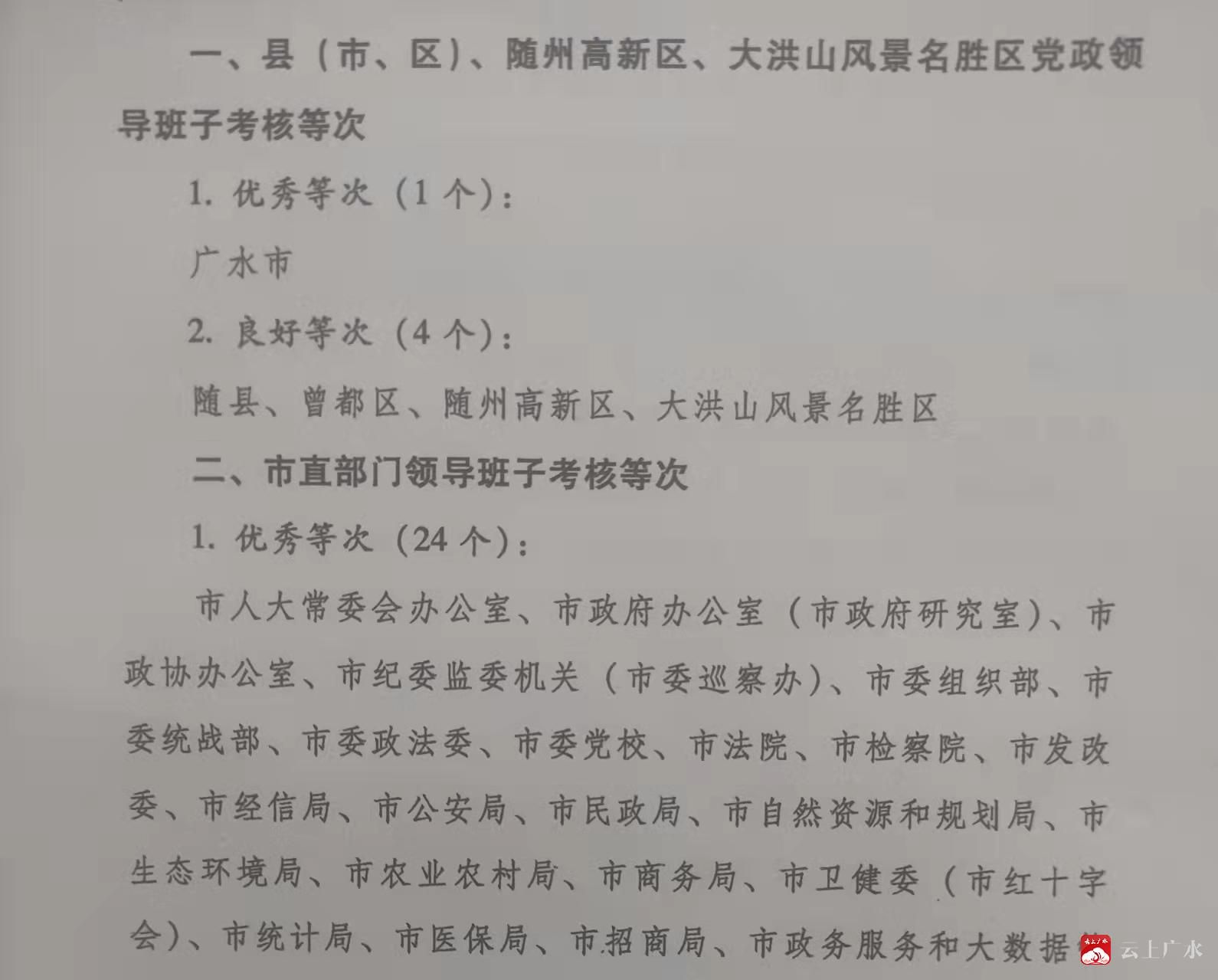 4月13日,随州市委办公室、随州市政府办公室发文通报了随州市市管领导班子2021年度考核等次,广水市党政领导班子考核等次为“优秀”。