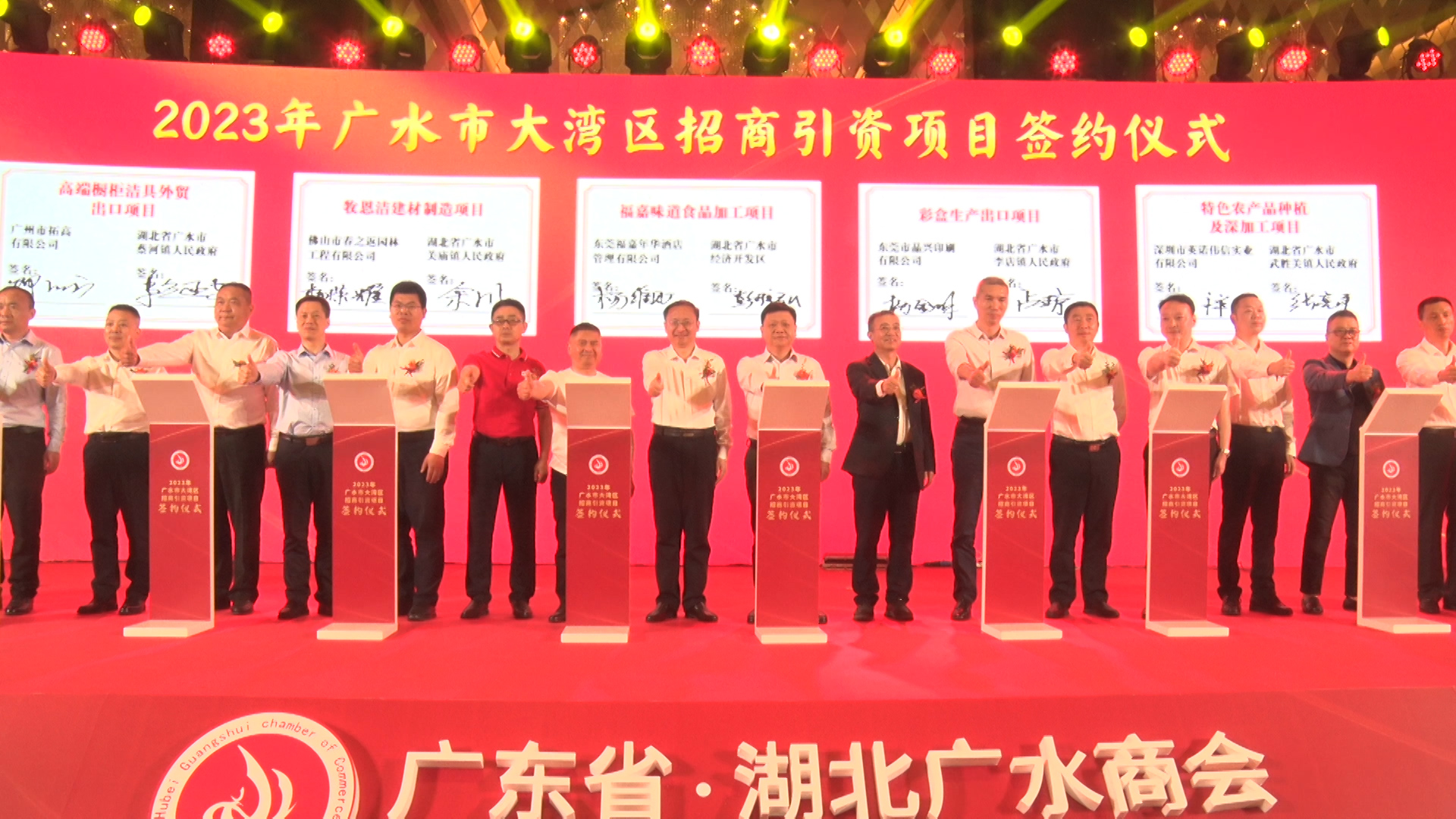 在“广东省(湖北广水)商会成立庆典暨招商引资项目签约仪式”上,广水市与华油鑫业工程技术、三利谱光电科技、福嘉年华酒店管理、今中福食品、威品塑胶五金、英诺伟信实业、鸿达利塑胶制品、晶兴印刷、春之返园林工程、拓高有限公司等10家企业现场签约,总投资21.35亿元。签约项目涵盖电器设备、光学膜高分子聚合物、食品加工、塑胶五金、特色农产品种植深加工、彩盒生产、建材制造、橱柜洁具等多个领域。
