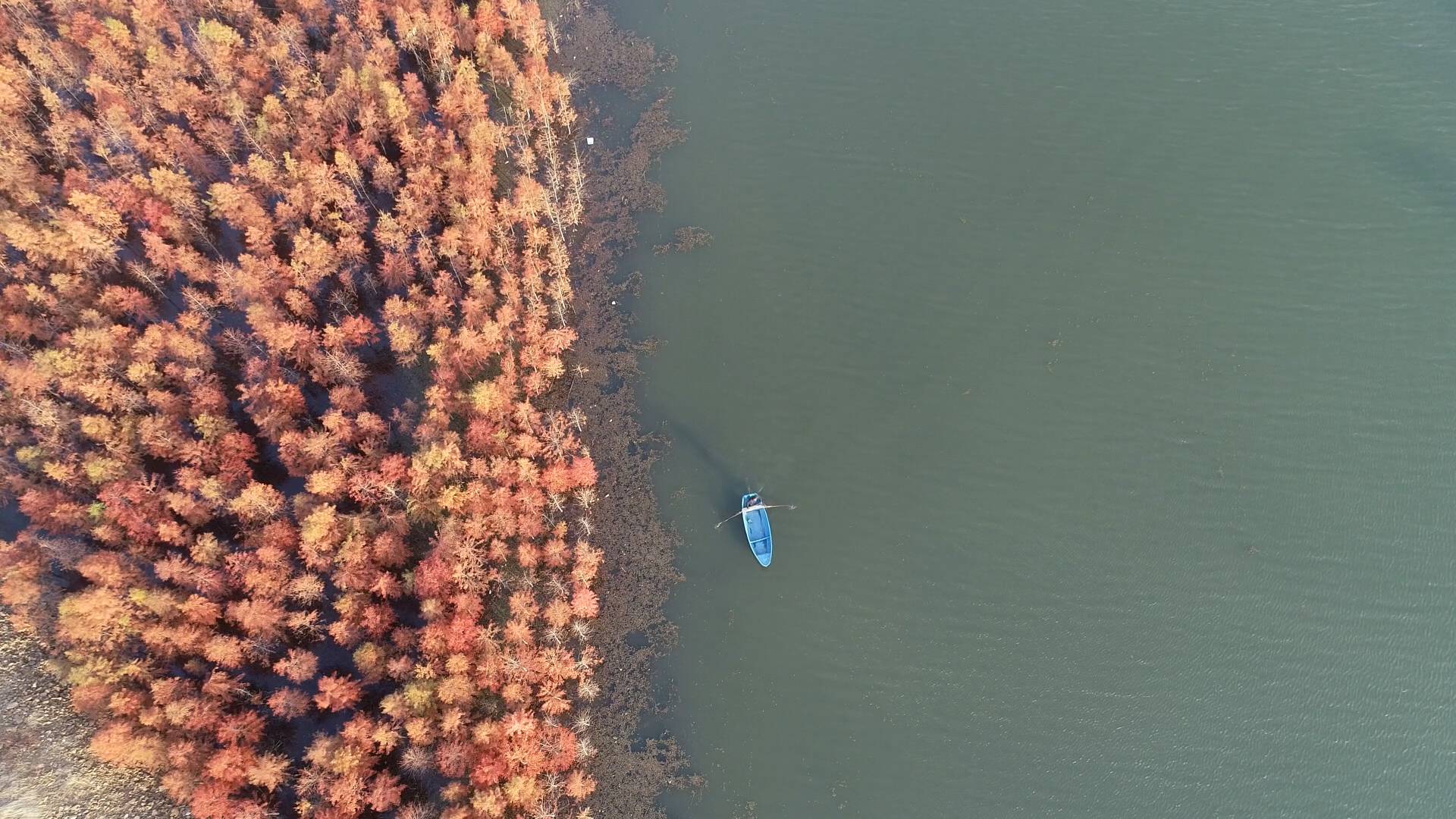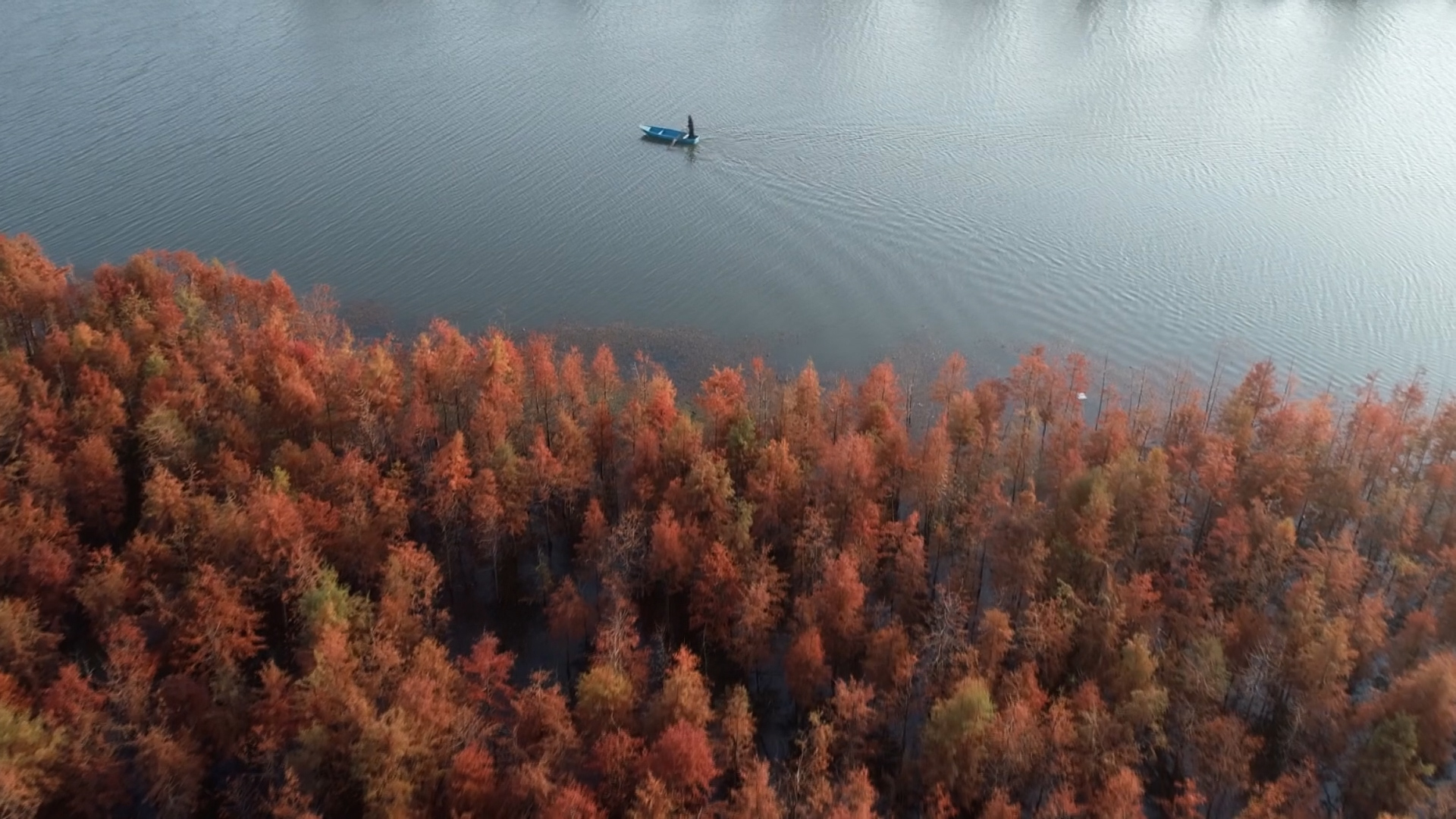 趁小船荡漾碧波,火红的杉树林,似朵朵红云倒映在如蓝如黛的清澈河水间,风光愈发秀美。船桨轻摇,惊飞野鸭和小䴙鹈,荡起涟漪,杉树的红和清波的绿交相辉映。冬日的阳光,穿透衫叶,愈发火红剔透,暖意融融。