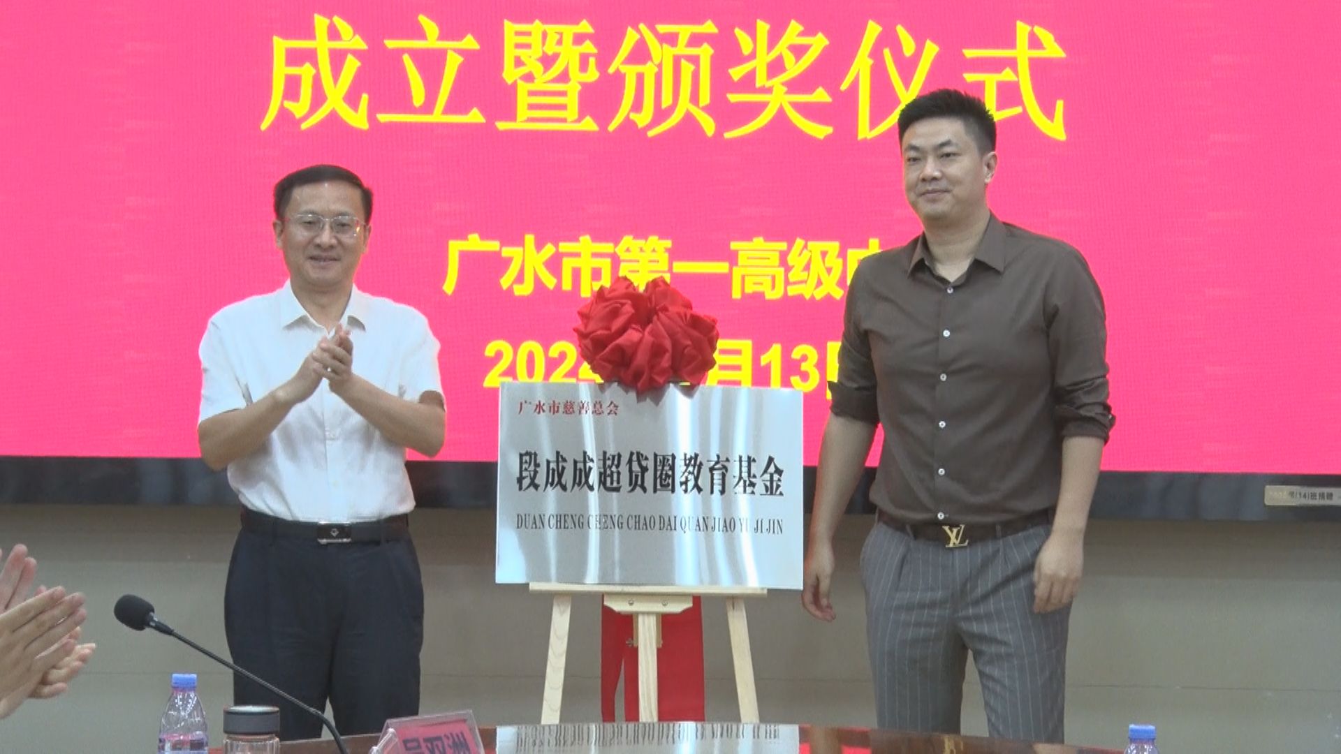 市委书记杨光胜,市长崔传金,市委副书记、市委政法委书记陈益军,副市长胡顺平,深圳(广水)商会会长王茂青,深圳(广水)商会副会长、广水一中深圳校友会会长、深圳市三利谱光电科技有限公司董事长张建军,深圳(广水)商会副会长、广水一中深圳校友会副会长、深圳市金邦德投资担保有限公司董事长段成成出席会议。陈益军主持教育基金成立仪式暨颁奖仪式。