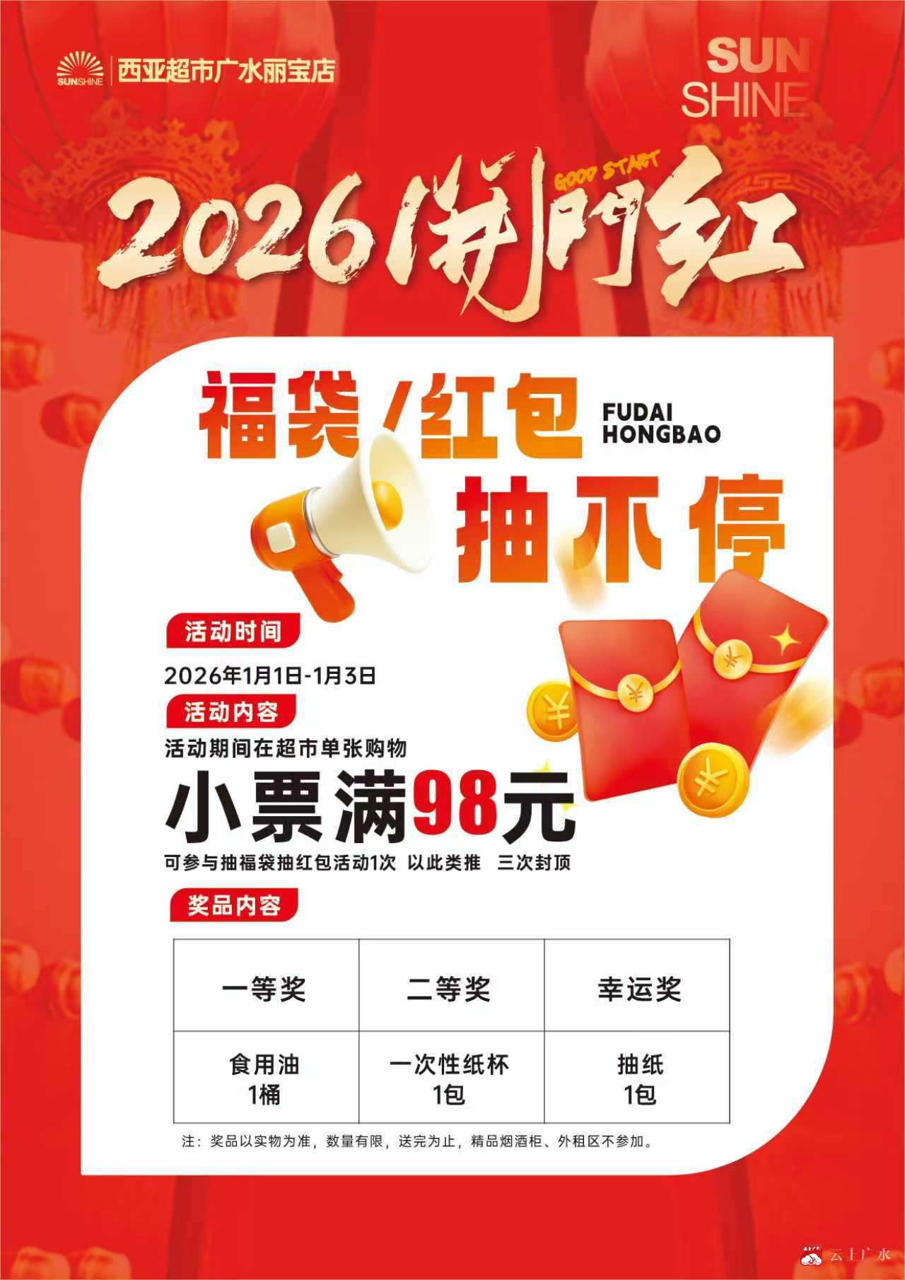 元旦将至,西亚超市推出“福袋红包抽不停”促销活动,以满额抽奖的形式为市民送上节日福利,让购物之旅满载惊喜,轻松迎接新年。