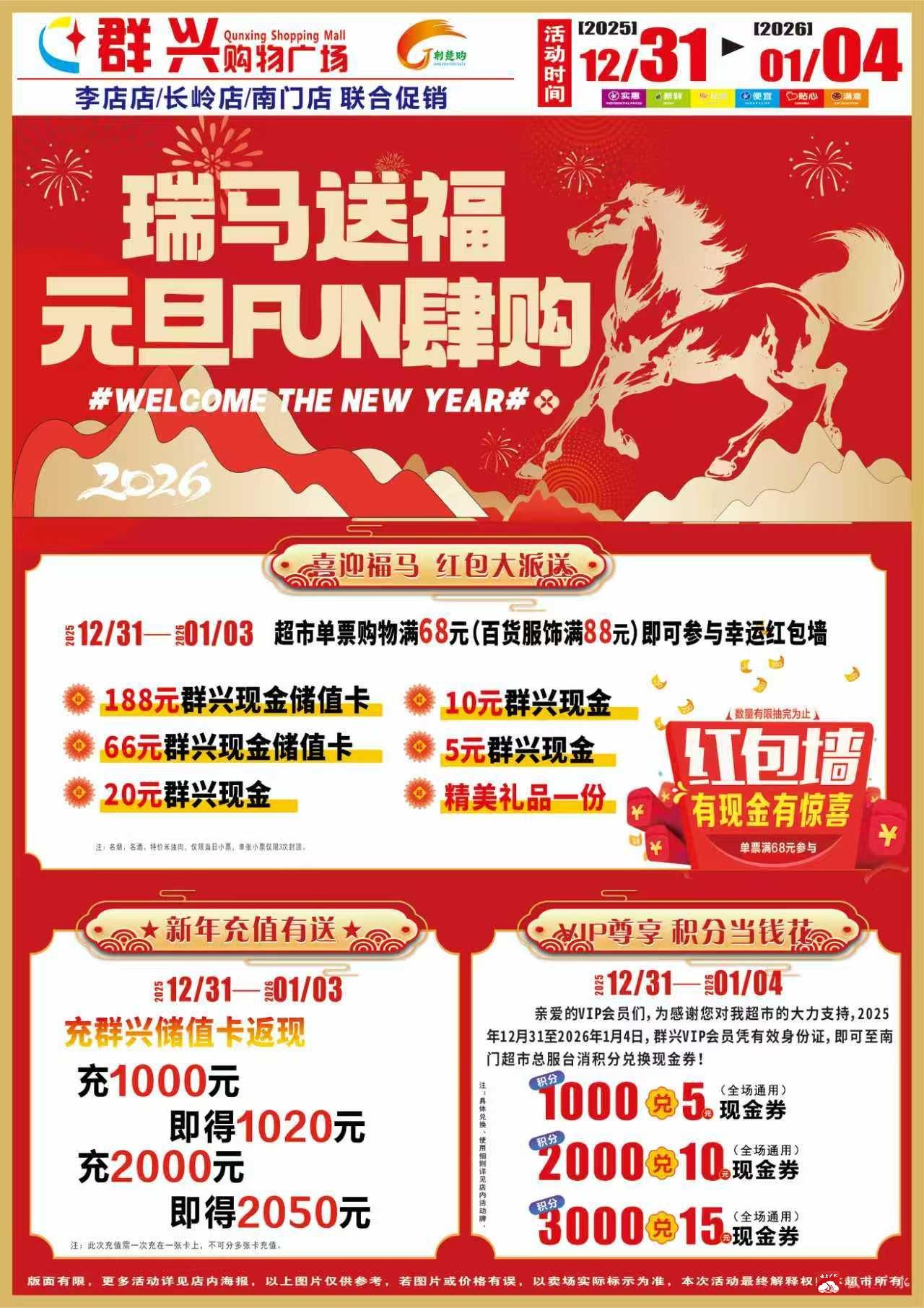 辞旧迎新之际,群兴购物广场推出“红包墙抽奖+储值返现”元旦促销活动,涵盖超市、百货、服饰、家电等多个品类,以多重优惠点燃市民消费热情,打造全方位购物狂欢。