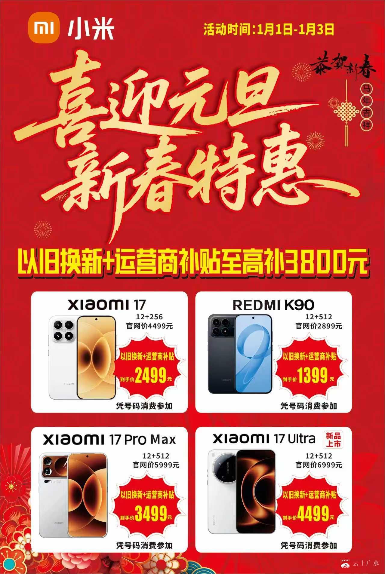 活动时间为1月1日至1月3日,两款爆款机型补贴力度空前:小米17官网原价4499元,补贴后仅需2499元,直降2000元;REDMIK90官网原价2899元,补贴后低至1399元,直降1500元,降价幅度大,性价比拉满。