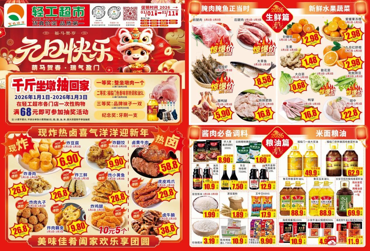 元旦佳节临近,轻工超市推出“千斤坐墩抽回家+现炸热卤”主题促销活动,以抽奖福利、生鲜粮油低价、特色美食等多重优惠,为市民囤年货、享美食提供高性价比选择,让节日消费更具仪式感。