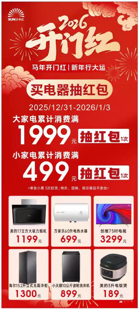 活动时间为12月31日至1月3日,抽奖规则明确:购买大家电满1999元可抽红包1次,小家电满499元可抽红包1次,单张小票最多可抽3次,多重惊喜等你来解锁。同时,多款热门单品低价来袭:美的油烟机1199元、万家乐热水器699元、创维75寸电视3299元,高性价比爆款直击消费者需求。数码区更是汇聚小米、vivo、华为等知名品牌机型,市民可到店亲身体验选购。