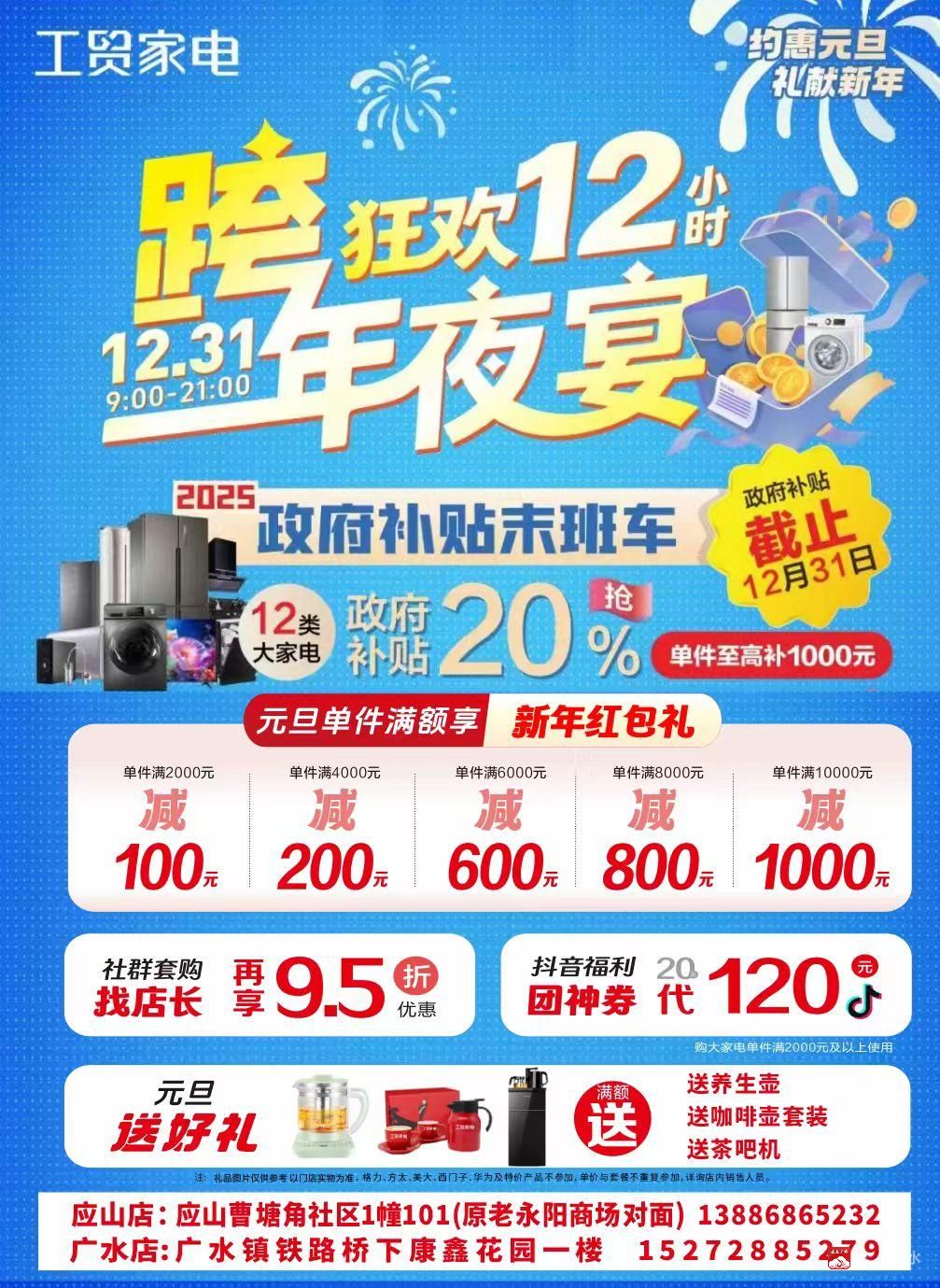 1.跨年狂欢夜(12月31日专属):9:00-21:00 12小时限时场,12类大家电享20%政府补贴,单件至高补1000元,补贴截止12月31日,错过再等一年。