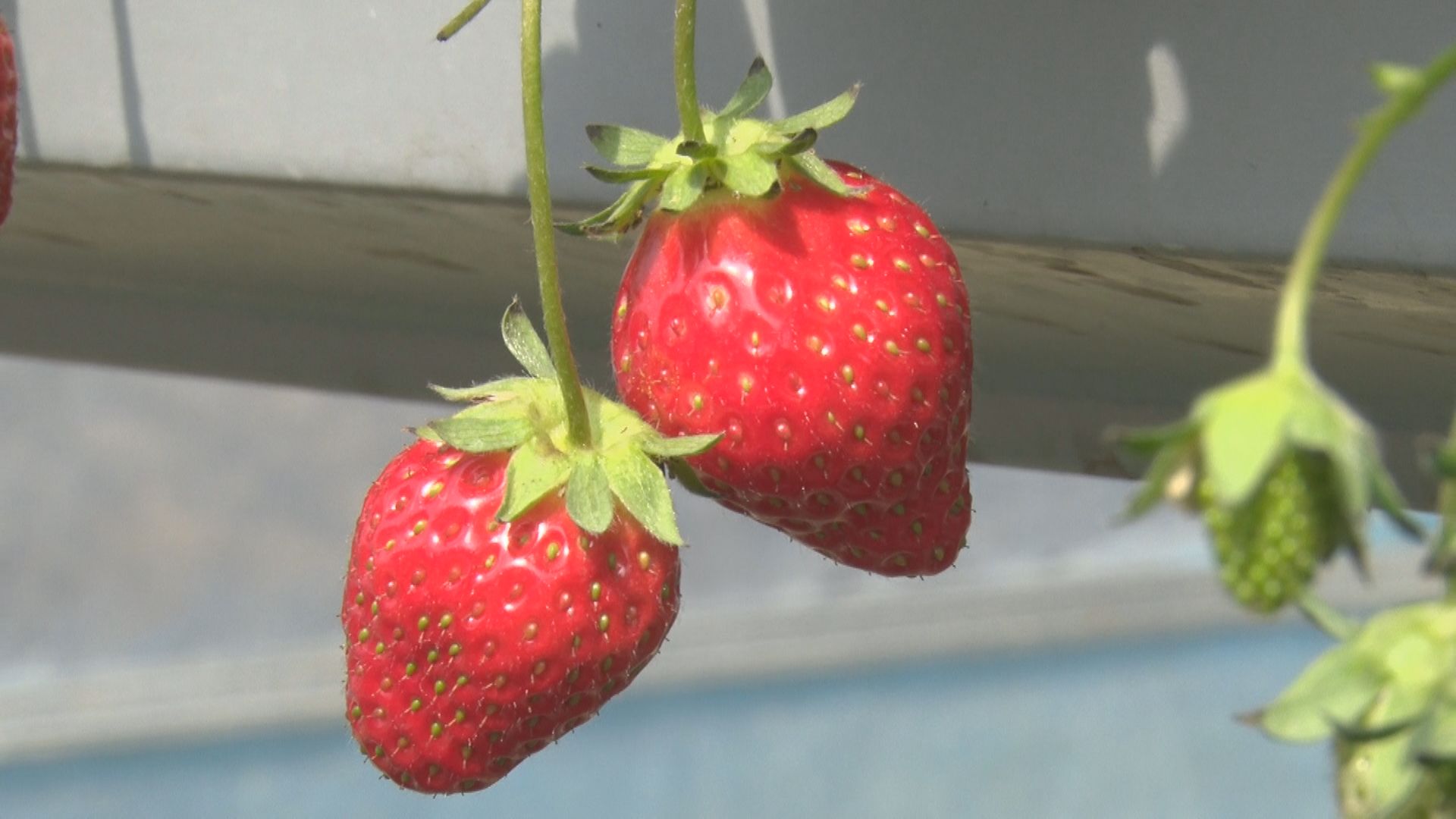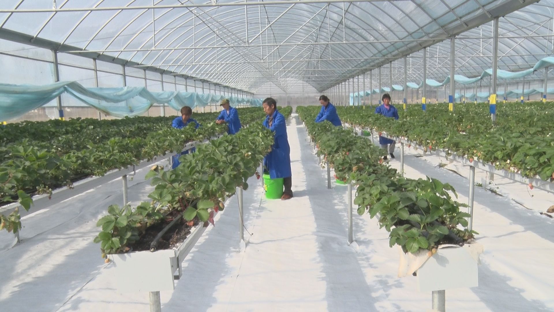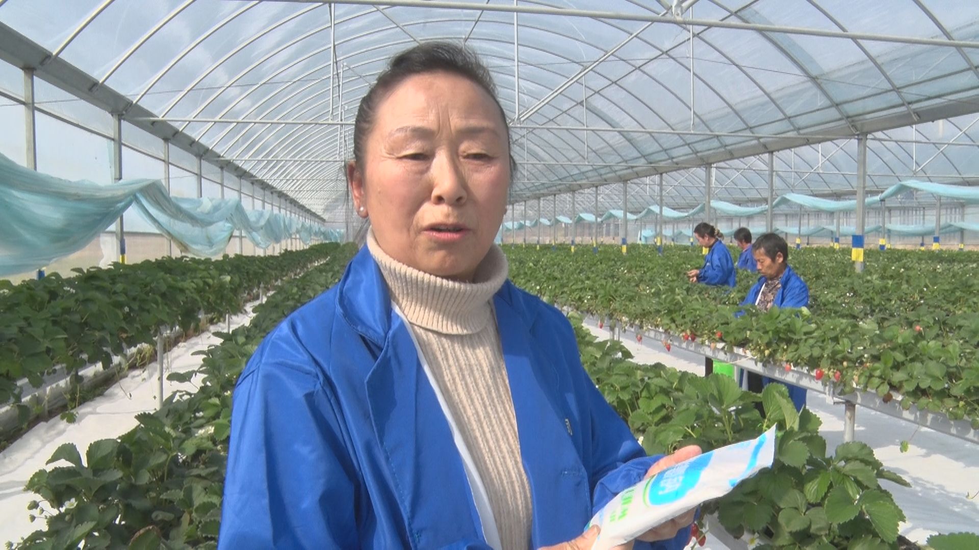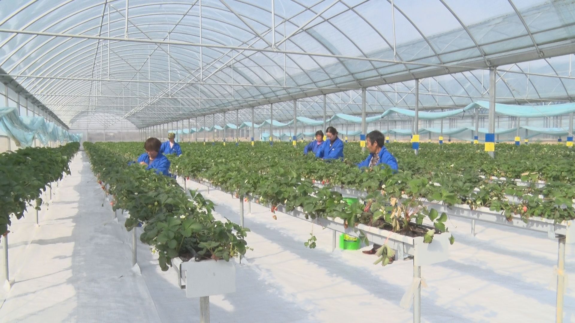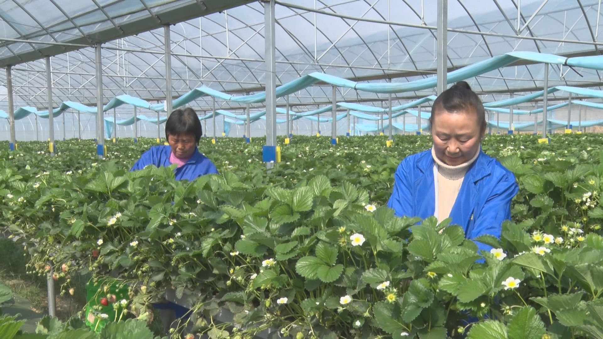 【同期声】基地农民刘著凤:“采摘期非常长,能达到六个半月。产量能达到每亩6000斤,产量非常高,周围的农民对这种草莓赞不绝口。”
