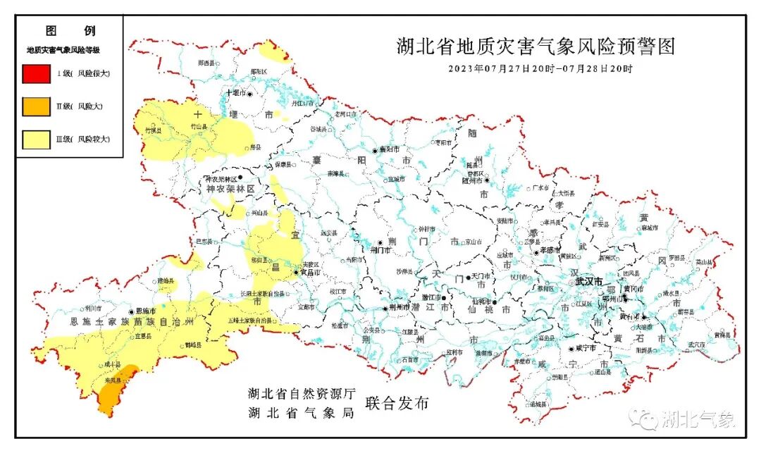 2023年7月27日20时-7月28日20时,预计三峡库区(兴山、秭归东部、夷陵),神农架林区南部、十堰(郧阳北部、竹溪、竹山、房县、丹江口南部)、襄阳(保康西部)、宜昌(宜昌市城区西部、长阳中部和南部、五峰)、恩施(恩施市南部、巴东中西部和南部、建始、利川南部、咸丰、来凤、宣恩、鹤峰)以及其他强降水区域发生崩塌、滑坡、泥石流的风险较大;其中,恩施(来凤大部、宣恩西南部)发生崩塌、滑坡、泥石流的风险大。