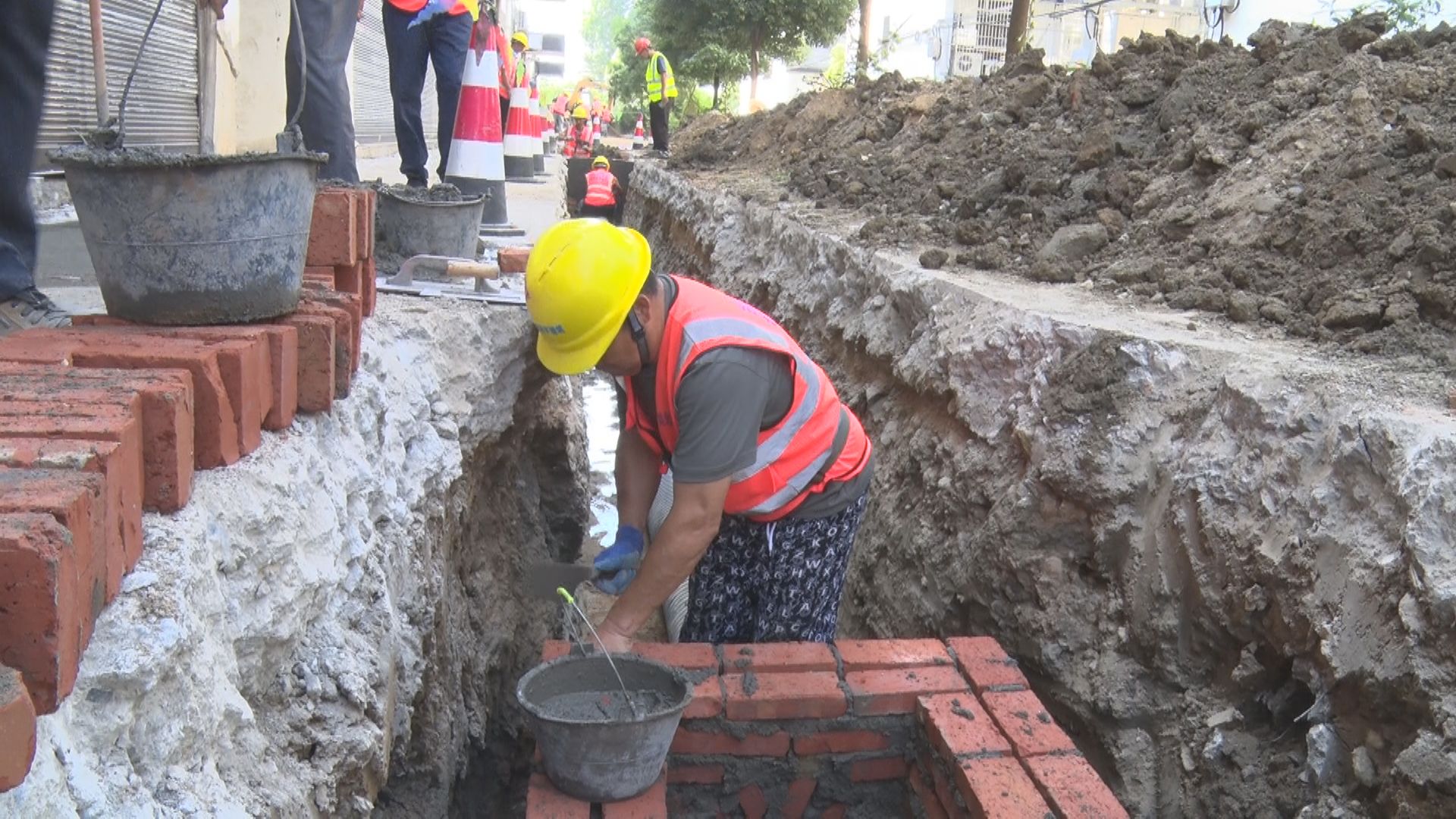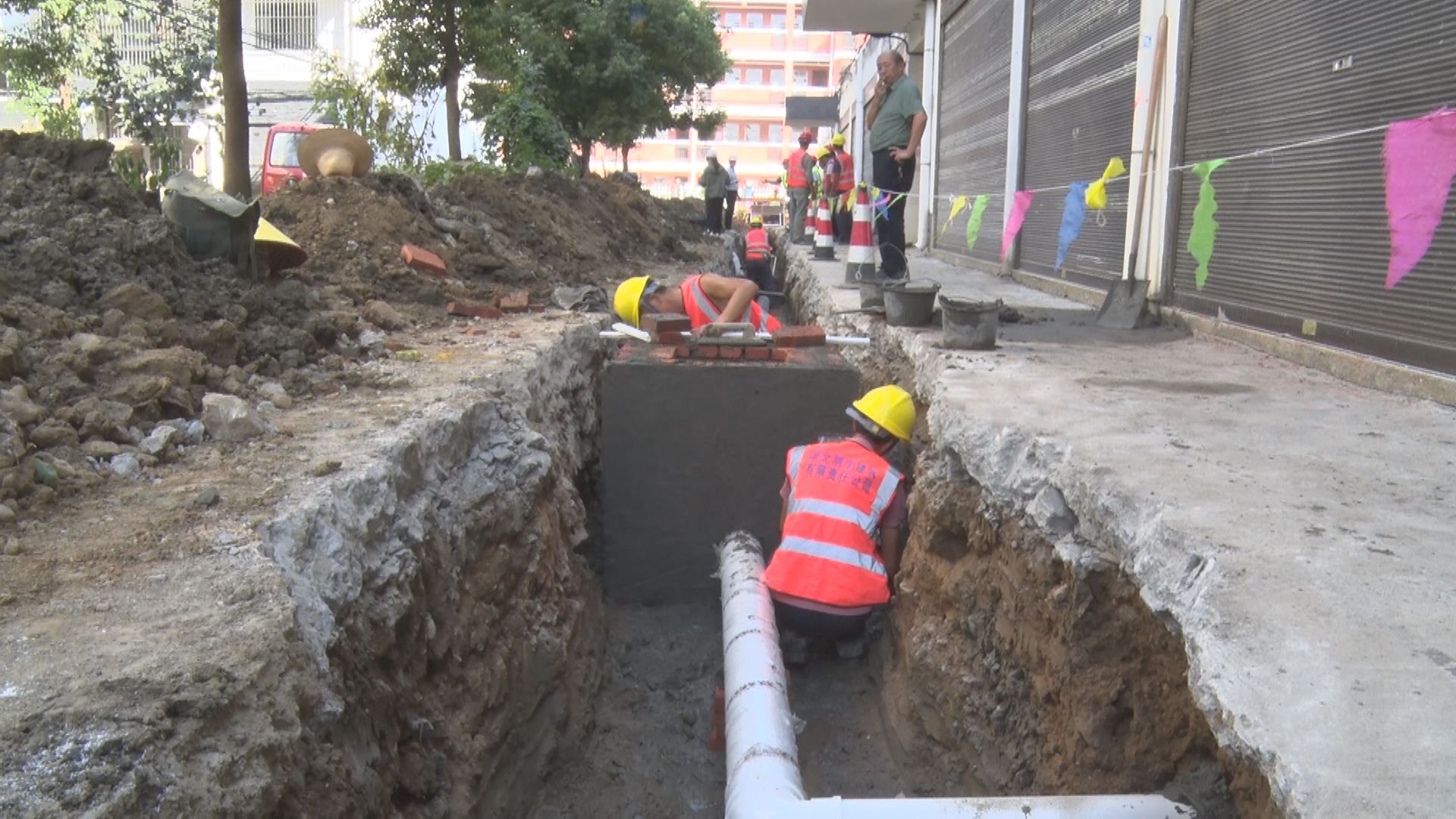 在马坪镇柳林小区,工人师傅操作大型机械设备挖掘管道,建砌方井,铺设排水管,污水处理厂及配套管网(二期)项目建设现场热火朝天。