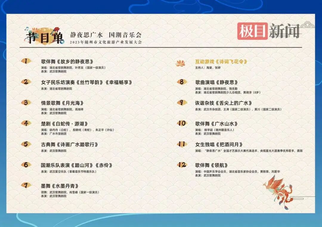 音乐会策划导演团队介绍,音乐会共设置了12个精彩节目及《诗词飞花令》等互动游戏,邀请了湖北省歌剧舞剧院、武汉歌舞剧院、武汉杂技团、广水市楚剧团等130余名演员联袂出演,演出时长约为90分钟。音乐会还安排了身着唐风汉服的演艺人员穿行园中,供游客拍照打卡和开展诗词问答等互动游戏,努力营造沉浸式体验氛围。届时,一曲来自湖北省歌剧舞剧院的优秀青年歌唱演员叶思言的原创歌曲《故乡的静夜思》将拉开音乐会的序幕。12位民乐姑娘身着中国传统旗袍奏响丝竹琴韵,著名歌曲《月光海》现场演绎,国潮摇滚乐激情狂欢,展现广水山水风情的歌舞、央视星光大道赛季优秀歌手龚丽独唱《把酒问月》、武汉国学社的小朋友将齐声诵读李白诗词《静夜思》……一个个精彩的节目将轮番上演,让观众全方位沉浸到中华优秀传统文化的氛围里。同时,在音乐会现场,湖北体彩还精心设置了顶呱刮竞速赛、投壶竞猜等多个互动游戏,准备了两部华为手机作为抽奖礼品。音乐会暖场阶段,现场观众可通过抢拨手机号游戏,抽取奖品手机一部;音乐会结束后,现场观众通过抢红包游戏,再抽取奖品手机一部。