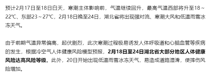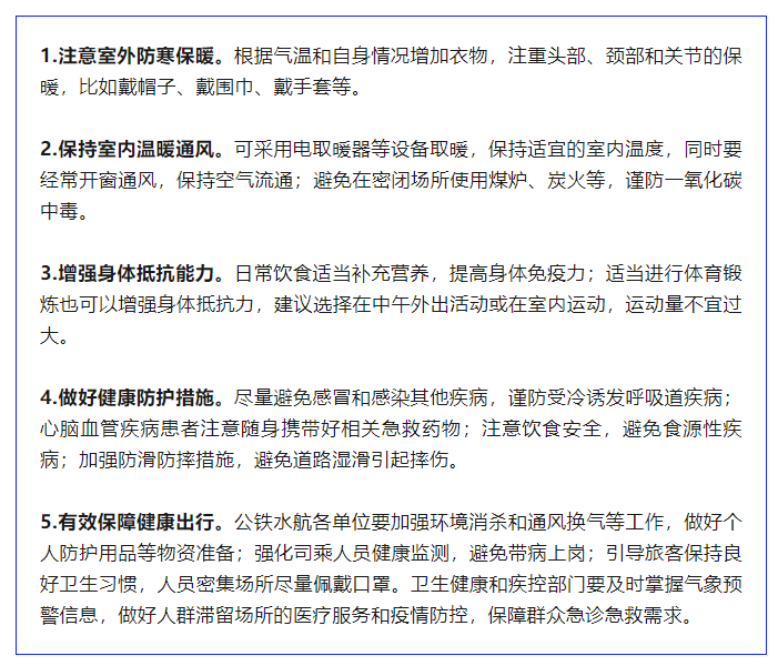此轮寒潮过程气温变化剧烈,且伴有大风和雨雪,体感温度低,易诱发感冒等呼吸道疾病以及心脑血管疾病,又恰逢春运返程出行高峰,人员流动大幅增加,可能会进一步增加交通滞留和健康风险。建议采取以下防范措施: