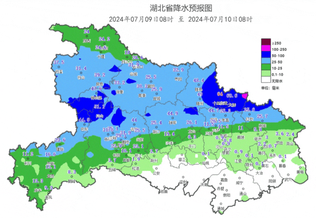 预计9日8时至10日8时,十堰、襄阳、随州、神农架、恩施北部、宜昌北部、荆门北部、孝感北部、黄冈西北部有大到暴雨,局地大暴雨,请注意防范。