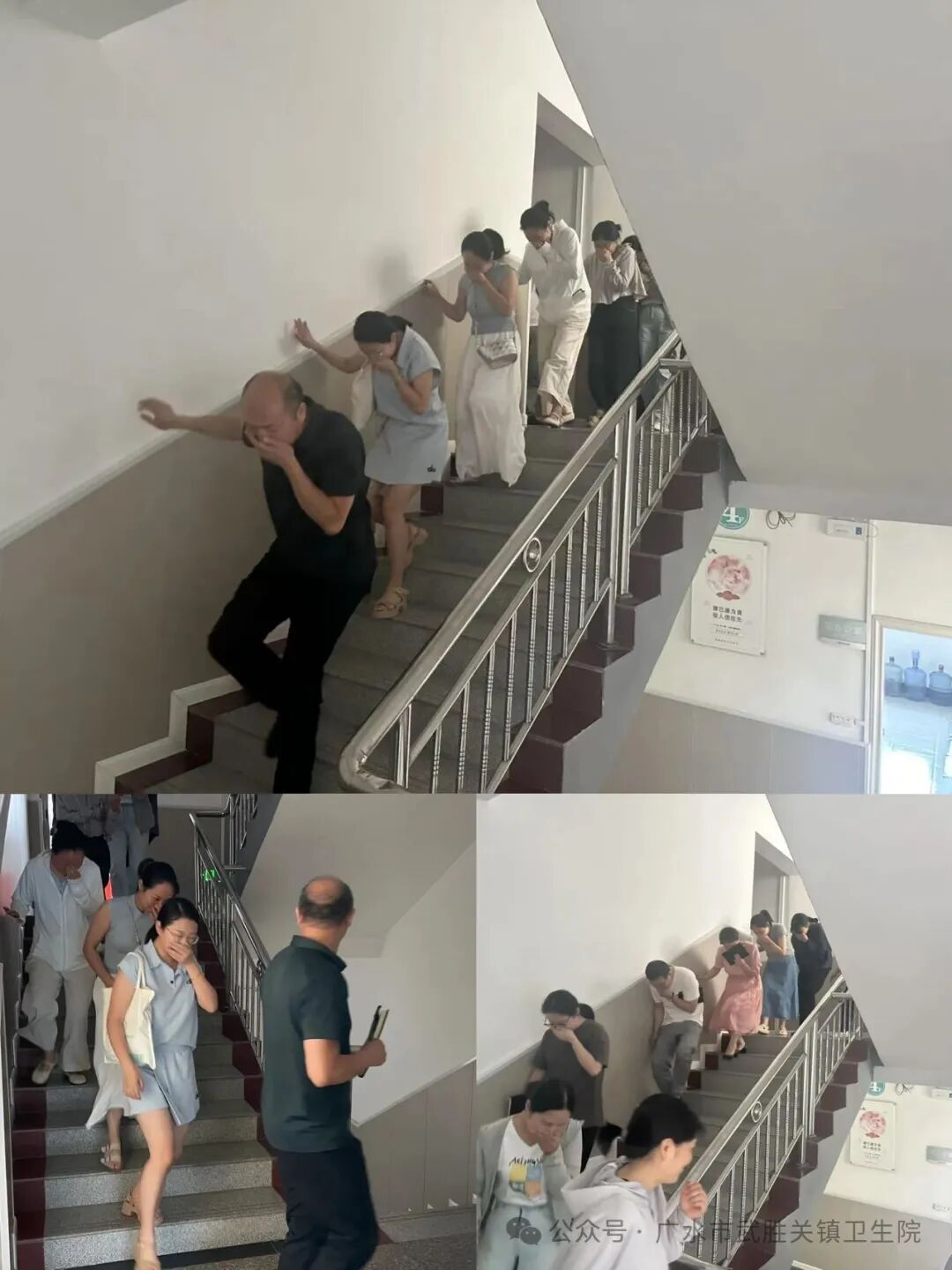 培训结束后,随即开展了消防应急演练。演练模拟了医院某一区域突发火灾的场景,随着警报声响起,各科室医务人员迅速行动,用手捂住口鼻,低姿弯腰沿着安全通道有序撤离至安全区域。
