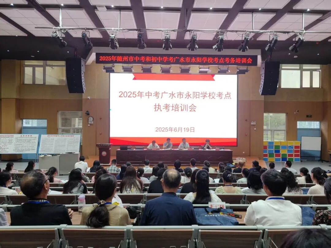 为提升考务人员的业务水平和责任意识,确保2025年中考工作安全、平稳、有序进行,6月19日,广水市永阳学校举行2025年中考考点执考培训会议。此次培训覆盖了监考人员、考务工作人员、各校领队等。