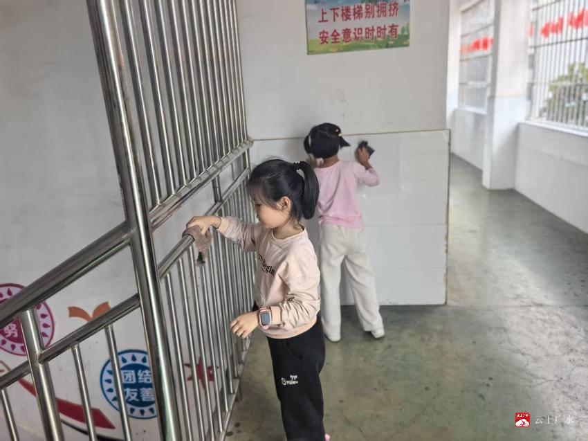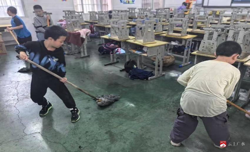 低年级同学踮脚擦拭门窗、墙壁,小手握着抹布来回舞动;中年级学生分组清扫教室,拖把挥动扬起阵阵“劳动旋风”;高年级同学主动承担重任,在老师的指导下细致清理学校各处卫生死角。大家分工协作,不怕脏累,汗水浸湿衣领,笑容却格外灿烂。