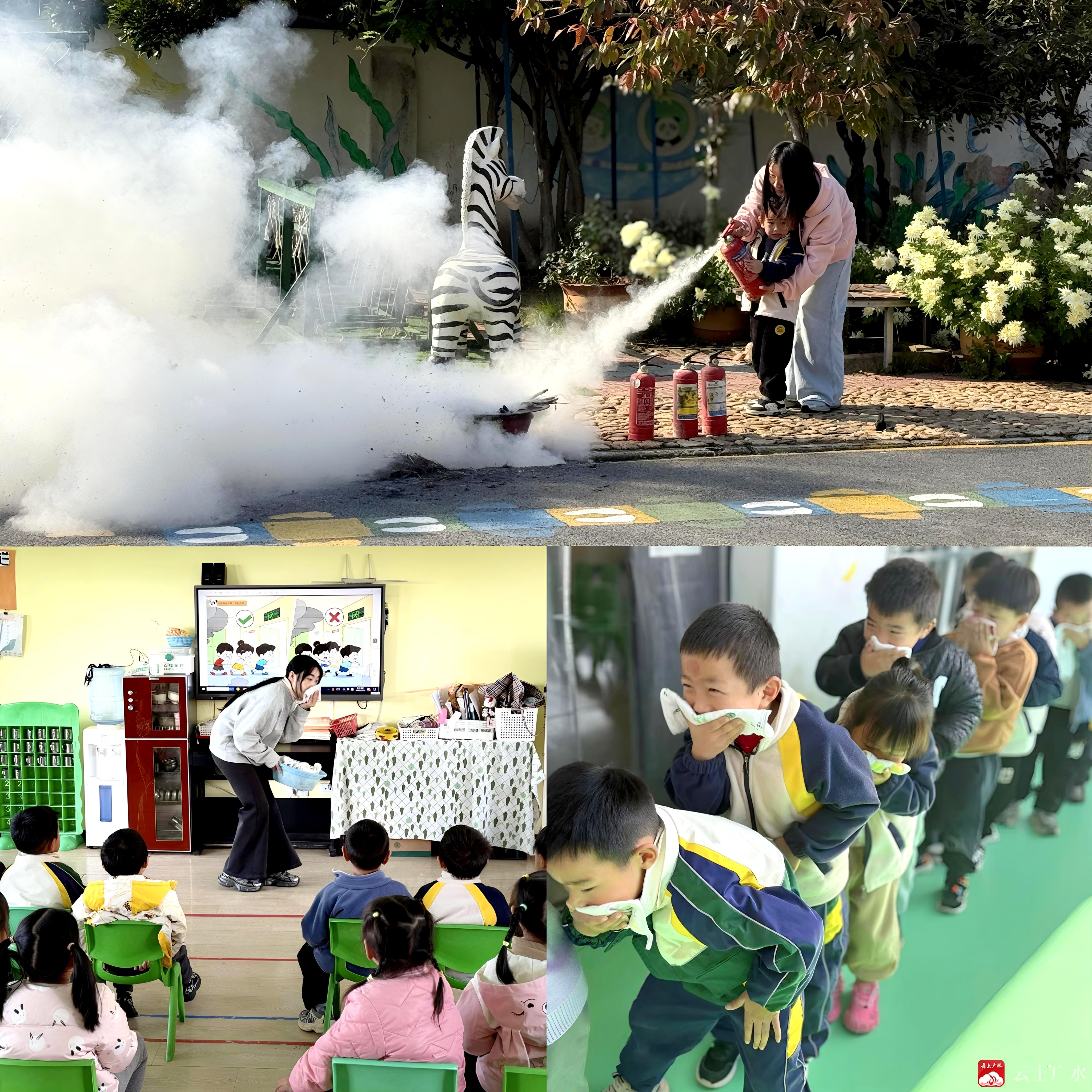 随着警报声响起,演练正式开始:孩子们在老师的引导下,迅速用湿毛巾捂住口鼻,弯腰低姿、有序排队,沿着安全通道快速撤离至空旷场地;与此同时,园内教职工分组配合,模拟初期火灾扑救——现场“火苗”旁,老师手把手指导孩子操作灭火器,白色烟雾中,萌娃们认真学习“提、拔、握、压”的灭火步骤,在实践中掌握自救技能。
