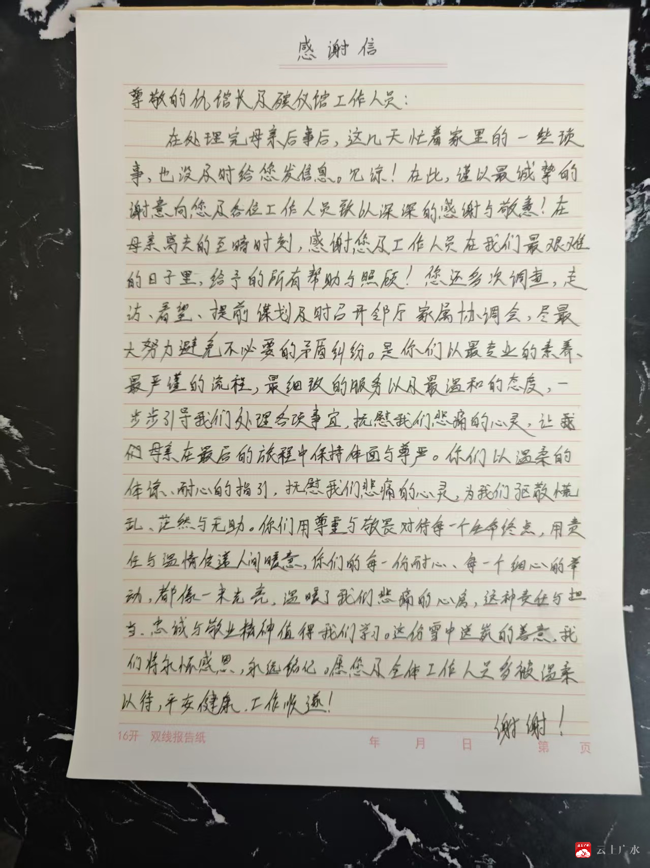 一纸书信,承载真挚谢意;满篇笔墨,映照为民初心。近日,广水市殡仪服务中心收到一封情真意切的感谢信,字里行间流淌的不仅是家属对服务人员严谨细致工作的充分肯定,更是对殡葬改革工作的理解与支持。
