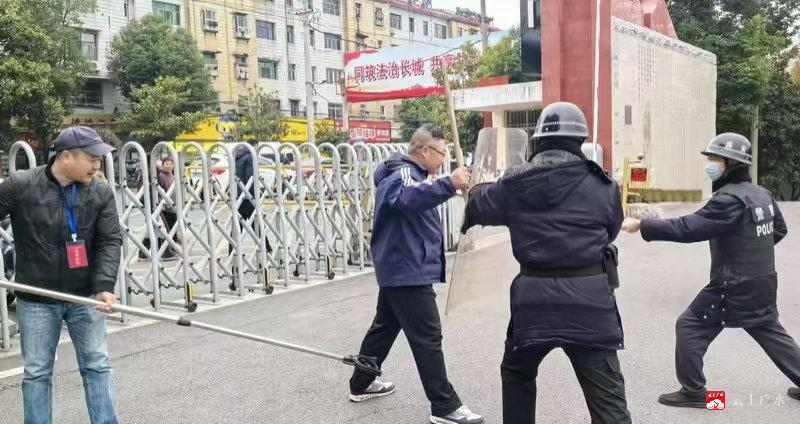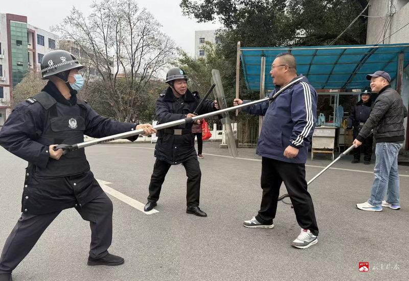 在实战演练环节,设定了模拟“歹徒”闯入校园的突发场景。一名保安扮演“歹徒”强行闯入校园,校长迅速启动最小应急单元反恐防暴应急预案,提醒师生撤离到安全区域。最小应急单元安全组成员迅速启动应急响应机制,两人持钢叉分别控制“歹徒”颈部和腿部,一人左手持盾牌防御、右手持警棍配合,还有一人用防暴喷雾辣椒水与“歹徒”进行周旋牵制。与此同时,一名成员快速按下一键报警按钮。整个演练过程紧张有序,各个环节衔接紧密,达到了分工明确、反应迅速、配合默契的实战要求。