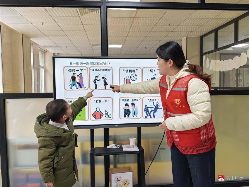 礼仪就像是一把神奇的钥匙,能打开人与人之间的友好之门。活动现场,义工老师结合生活中的情景、故事等用通俗的语言讲解文明礼仪常识,“待人之礼”“行走之礼”……并展示一组组贴近生活的文明礼仪对比图,画面里既有主动问好、排队礼让、双手递物的文明行为,也有大声喧哗、乱丢垃圾、打断他人讲话的不文明举动。孩子们化身“文明小裁判”,纷纷举手抢答,不仅准确分辨出对错,还能清晰说出理由,在你来我往的问答中,让孩子们沉浸其中从小接受熏陶,培养其文明习惯。
