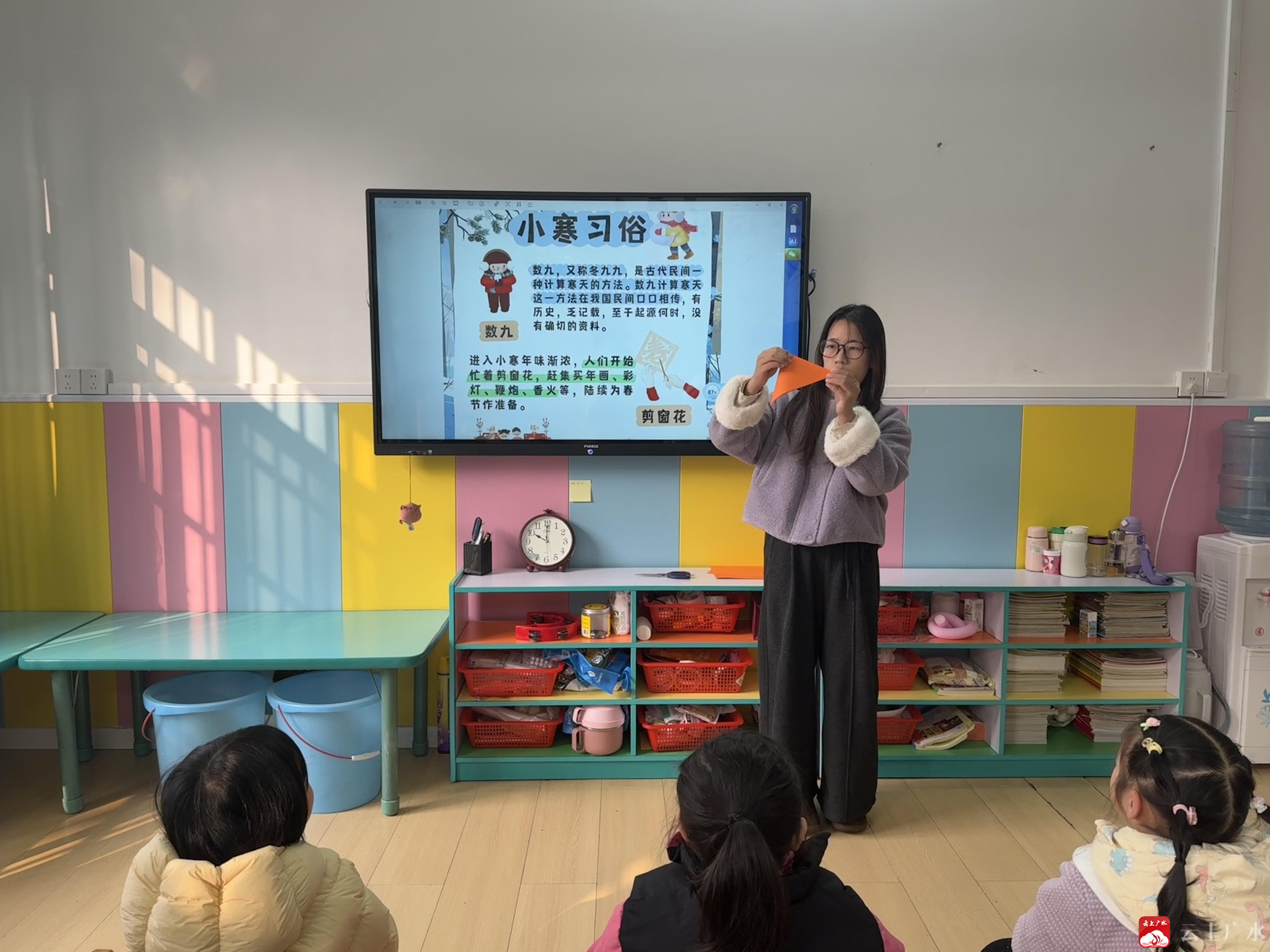 活动中,老师们通过生动的图片、有趣的故事,向孩子们讲解了小寒的由来和特点。“小寒到,年味近”,孩子们在老师的带领下,一起动手制作冬日手工作品。红彤彤的纸剪窗花在小手中绽放,孩子们的欢声笑语温暖了整个教室。幼儿初步了解了小寒习俗,学习“数九”歌谣,尝试腌制腊八蒜,在动手操作中了解民俗;有的班级幼儿围绕“冬日养生”展开讨论,分享保暖小妙招,还为家人制作了“暖冬小贴士”卡片。此外,各班还组织了“冬日暖身”小游戏,跳绳、踢毽子、钻山洞,孩子们在运动中舒展身体,抵御严寒,也体会到了冬日锻炼的乐趣。