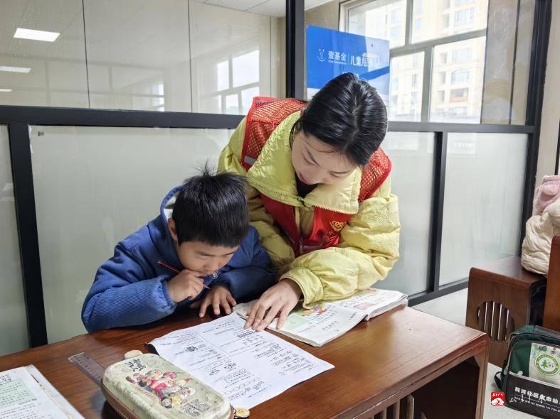 活动前,义工们针对孩子们课后作业中的疑难点,进行一对一细致指导,帮助孩子们理清解题思路,掌握答题技巧。(通讯员刘欣怡 易子情)
