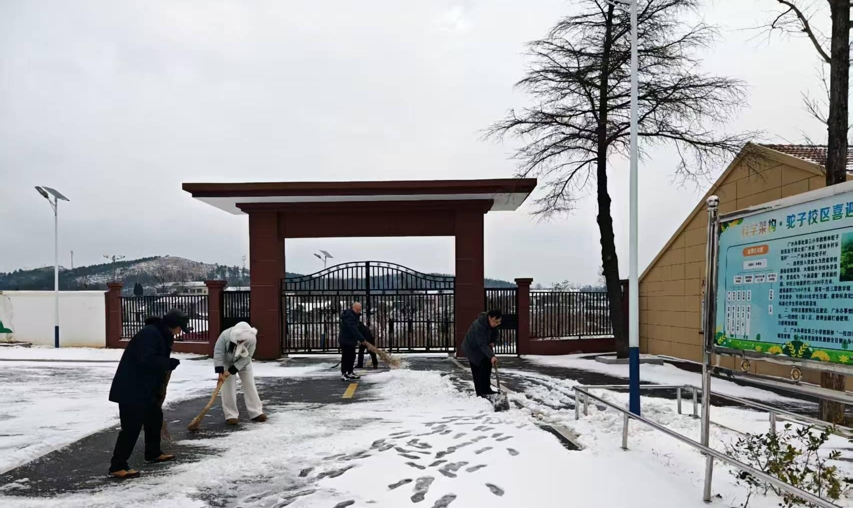 昨夜今晨,一场瑞雪席卷校园,银装素裹的景致虽美,却给师生出行带来诸多不便。为保障校园道路畅通、消除安全隐患,广办驼子中心小学党支部迅速响应,发出“扫雪除冰,党员先行”的倡议,全体党员同志带头冲锋,与教职工们一道,以实际行动践行责任担当,为校园筑牢安全防线。