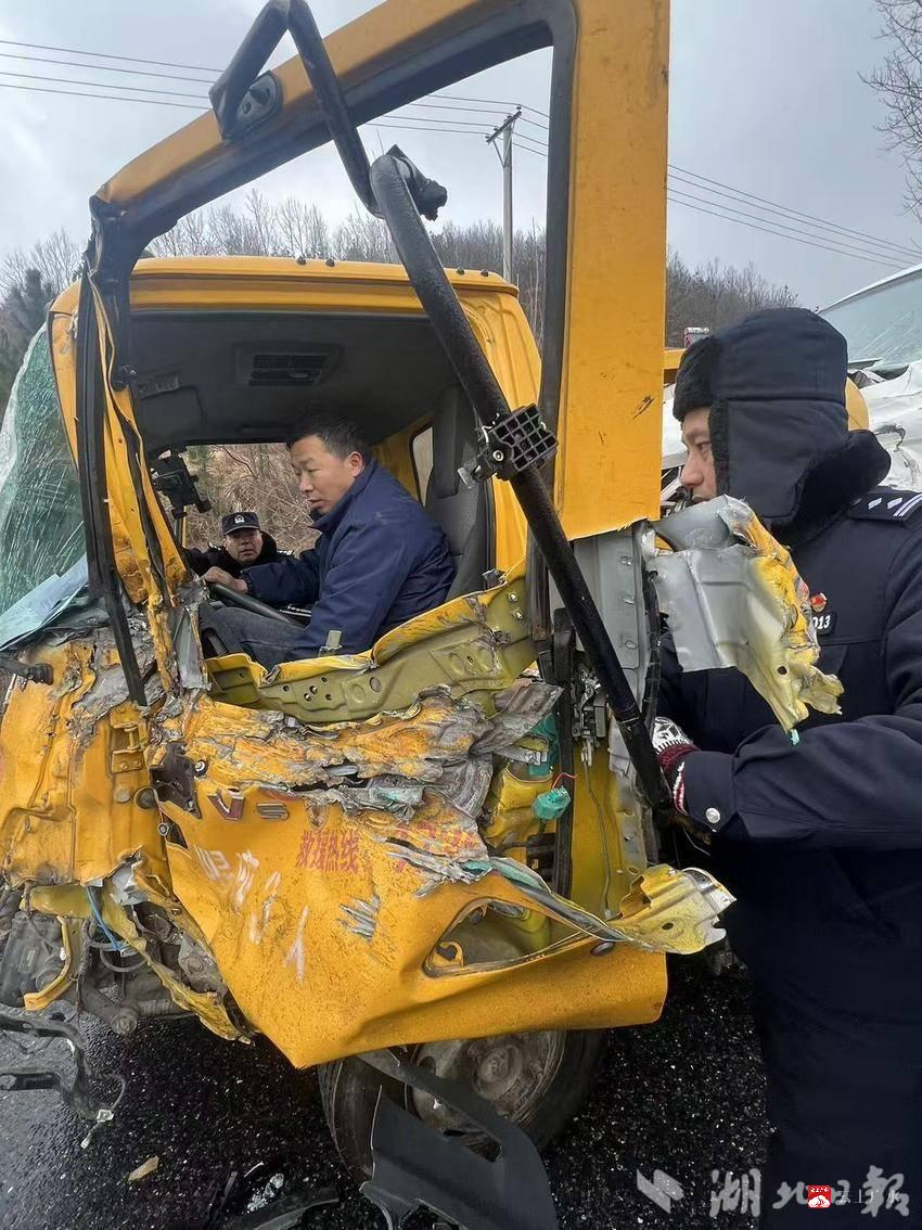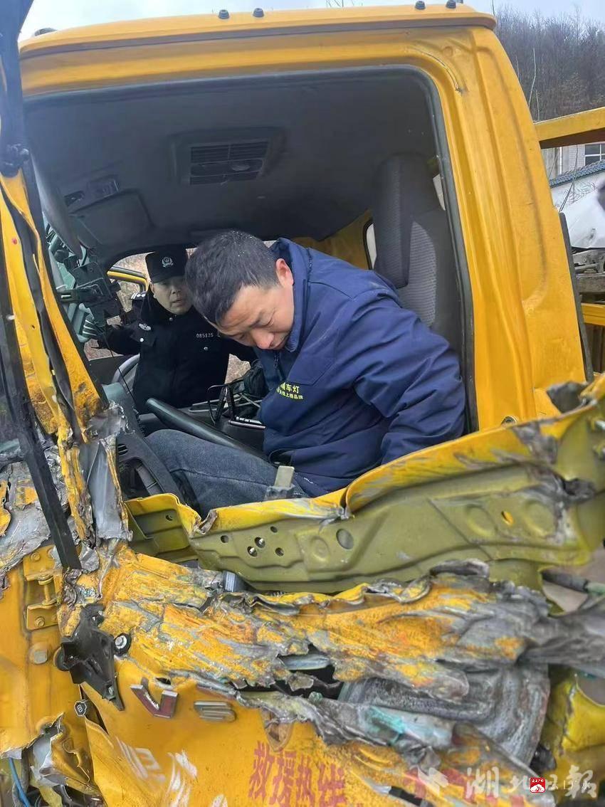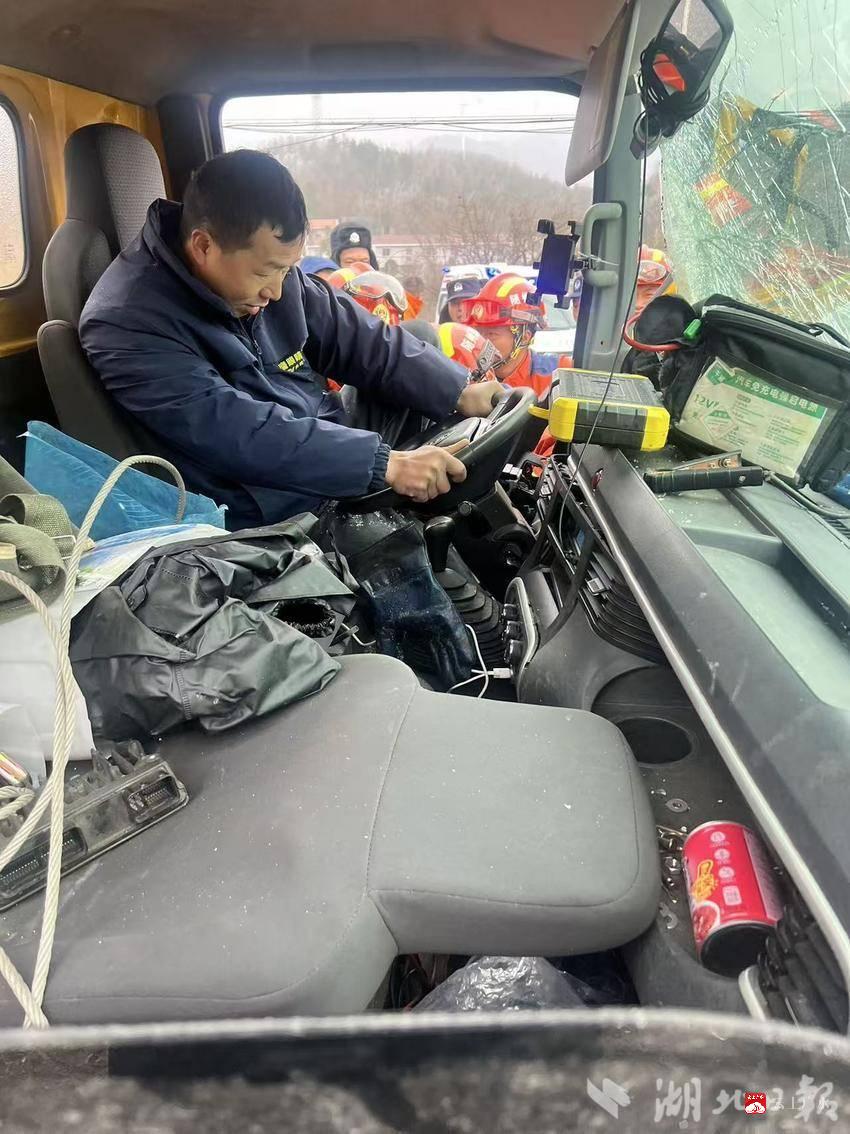 “别着急,我们来了,腿如果不舒服千万别乱动!”1月19日13时许,S210省道广水蔡河路段的寒风中,一句焦急而有力的喊话,让被困在驾驶室内的司机陈某吃了一颗“定心丸”。