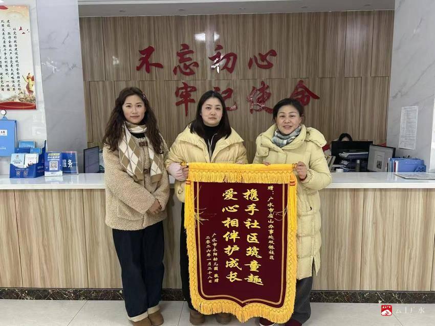 1月29日,永阳幼儿园负责同志将一面绣有“携手社区筑童趣 爱心相伴护成长”字样的锦旗送到双桥社区,感谢社区长期以来对幼儿园安全工作的大力支持。
