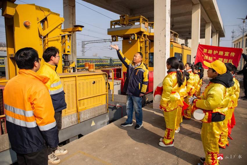 随后,宣传队伍来到京广线线路旁。腰鼓队员们向沿线村民发放宣传资料,信阳工务段广水线路车间工作人员现场讲解铁路设施设备的重要性及安全注意事项。在信阳供电段广水供电车间,腰鼓队员们参观了铁路机车车辆,工作人员细致讲解机车工作原理和安全注意事项,并通过互动问答形式为学生们送上精美小礼品。