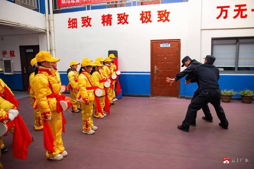 队伍转至广水火车站。执勤民警、车站职工、安检队员与腰鼓队员一起向周边居民和旅客发放春运出行安全手册。此外,在车站工作人员的引导下,孩子们来到进站口观摩安检流程及注意事项,学习“乘坐火车禁限带物品规定”。