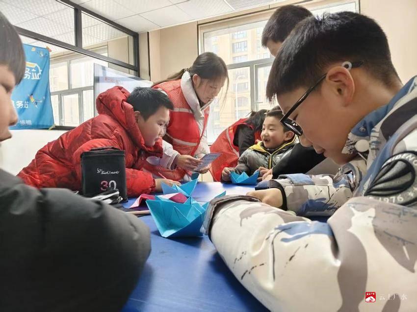 “折纸是我国传统的民间艺术,有着近千年的历史,是训练手指灵活性、协调性的好方法。”大学生志愿者老师为孩子们明确“手工折纸”的益处,并通过PPT课件和现场演示讲述折纸操作技巧。孩子们认真聆听、边听边做,大家互帮互助、相互学习,不一会,一张张彩色手工纸,变成了孩子们手中独一无二的折纸作品。