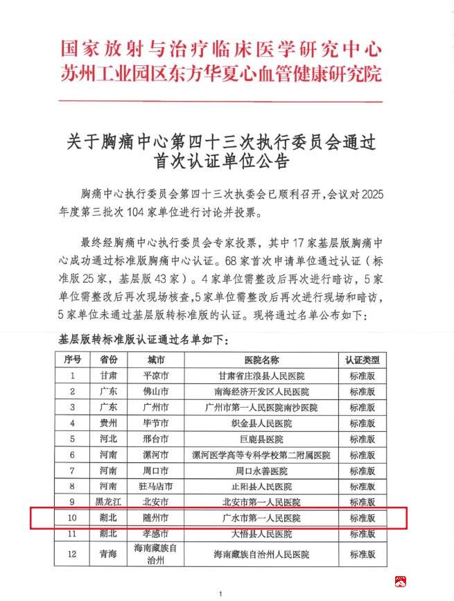 2月4日,国家放射与治疗临床医学研究中心与苏州工业园区东方华夏心血管健康研究院联合公布了胸痛中心第四十三次执委会认证结果,广水市第一人民医院胸痛中心顺利通过评审,成功由“基层版”升级为“标准版胸痛中心”,标志着该院胸痛中心建设迈入更高质量、更规范化的新阶段。