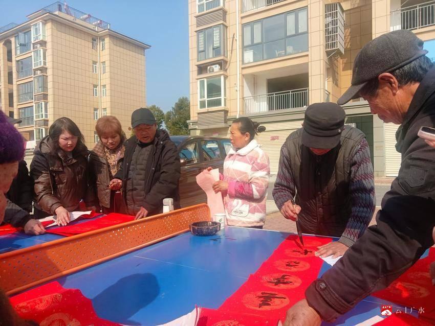 2月4日(腊月十七),广水市十里街道马都司社区综合文体广场上墨香四溢、暖意融融。市书法家协会十里书法分会组织8名骨干会员为居民义务书写春联350多副,浓浓的年味迎面而来。