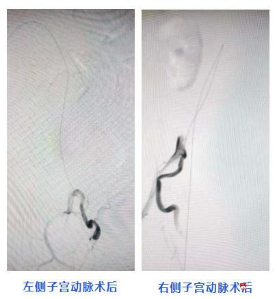 锁定出血位置后,介入团队果断通过微导管向子宫左、右两侧出血的血管内分别注入明胶海绵颗粒,对破裂出血的血管进行精准栓塞。术后即刻复查造影显示:双侧子宫动脉出血血管被成功封堵,止血效果立竿见影。整个手术过程快速、顺利,不仅有效控制了出血,更最大限度地保护了产妇正常的子宫组织,为乐女士未来的健康和生活质量保留了希望。