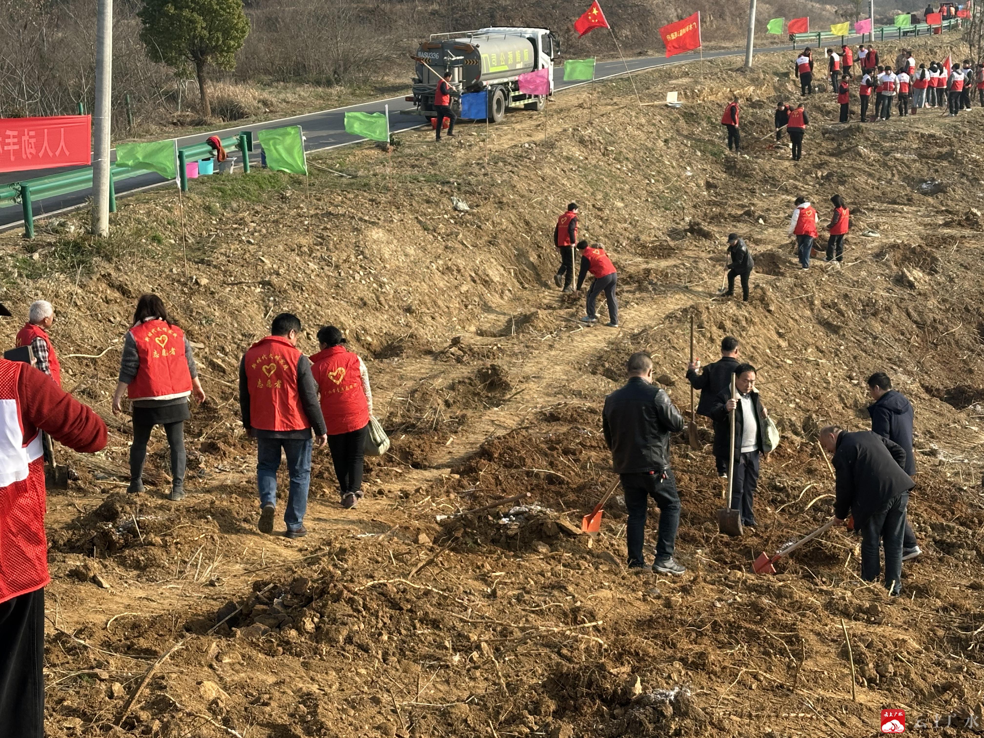 活动现场,党员干部冲锋在前作表率,志愿者分工协作显默契,村委会精准定位树苗“新家”。最引人注目的莫过于那辆开到路边的洒水车,水流如银线般为幼苗送上“生命之源”。“这不仅是一次植树,更是一堂生动的文明实践课。”长岭镇宣传委员闻龙表示,“要让志愿服务成为长岭最温暖的名片。”