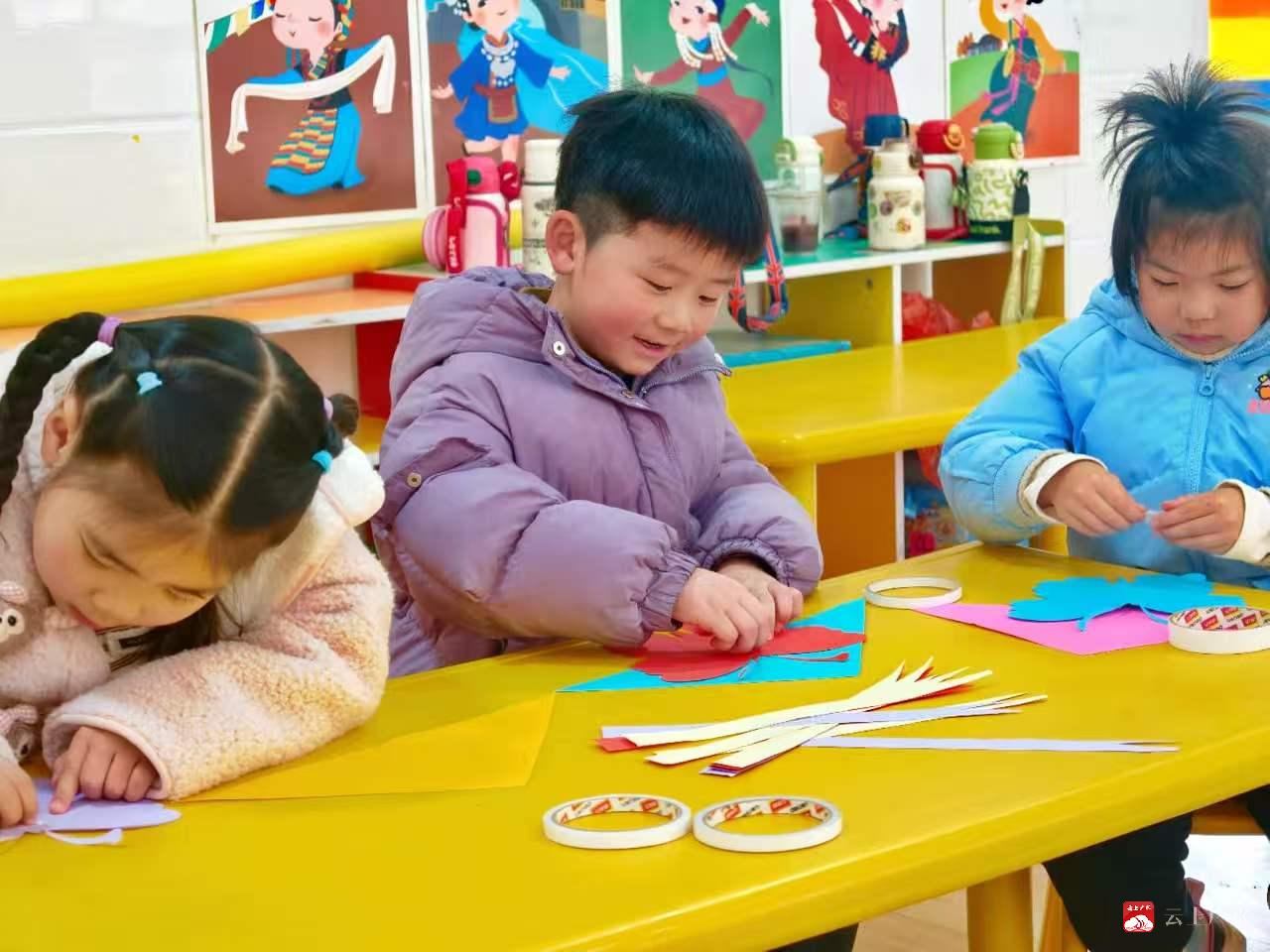 在手工创作环节,孩子们化身小小巧匠,围坐在桌前认真制作春分纸鸢。他们拿起彩纸、剪刀和胶带,细心裁剪、耐心粘贴,将缤纷色彩与春日想象融入纸鸢创作中:红色蝴蝶、蓝色花纹、紫色爱心……一只只充满童趣的纸鸢在小手中渐渐成形,每一道折痕、每一笔装饰都藏着孩子们对春天的喜爱。