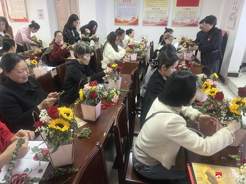 在插花体验环节,花艺老师指导家长动手创作花艺作品,在互动中舒缓压力、放松身心,现场氛围温馨融洽。