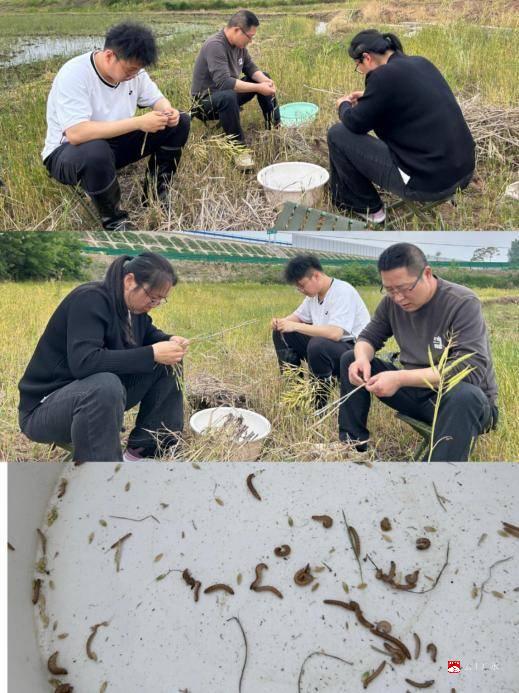 (图:4月27日,老技术员带领新进人员到蔡河剥查二化螟发育进度、查看小麦赤霉病,老技术员现场教学虫态识别与病害诊断)(通讯员:高树民)